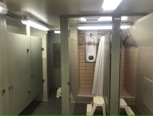 The central bathhouse has a men’s and women’s side. Each contain three showers and three sinks and either four toilet stalls or two toilets and two urinals.