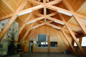 Main Lodge with a full commercially equipped kitchen (no food service available), dining/meeting hall, fireplace and central heat; upstairs apartment located above lodge with kitchenette and two rooms (three beds in each room).